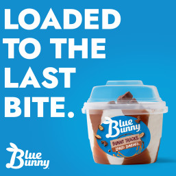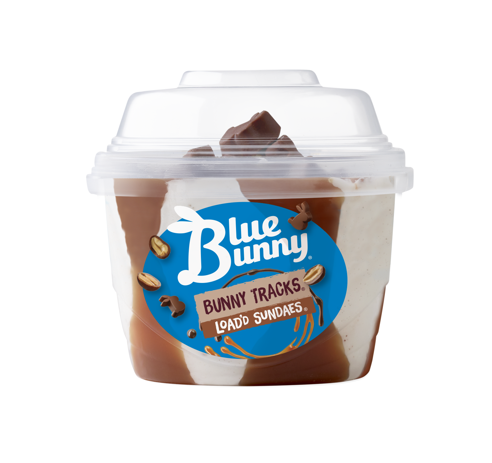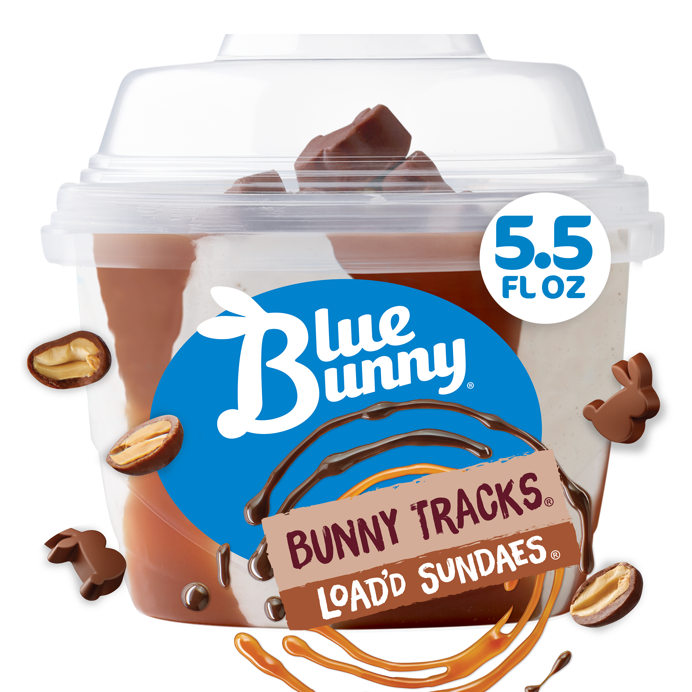 Now available in a 5.5 fl oz fun-sized cup! Indulge in the swirls and mix-ins packed into every spoonful of Blue Bunny Load'd Sundaes Bunny Tracks Frozen Dairy Dessert. This one-of-a-kind cup is loaded to the max with sundae toppings, so there's never a boring bite. Soft vanilla flavored frozen dairy dessert is swirled through with ooey gooey caramel and fudge, mixed with chocolatey covered peanuts and chocolaty peanut butter bunnies. It's a spoon-ready sundae experience straight from your freezer. What are you waiting for? Indulge in these portable, fully loaded frozen treats wherever you go. At work, in the car, on the couch—pretty much every place is more fun with these frozen desserts. Blue Bunny Load'd Sundaes come in compact, single-serve dessert cups, so it's easy to stock your freezer with all flavors of these sweet snacks. Blue Bunny—We Make Fun.