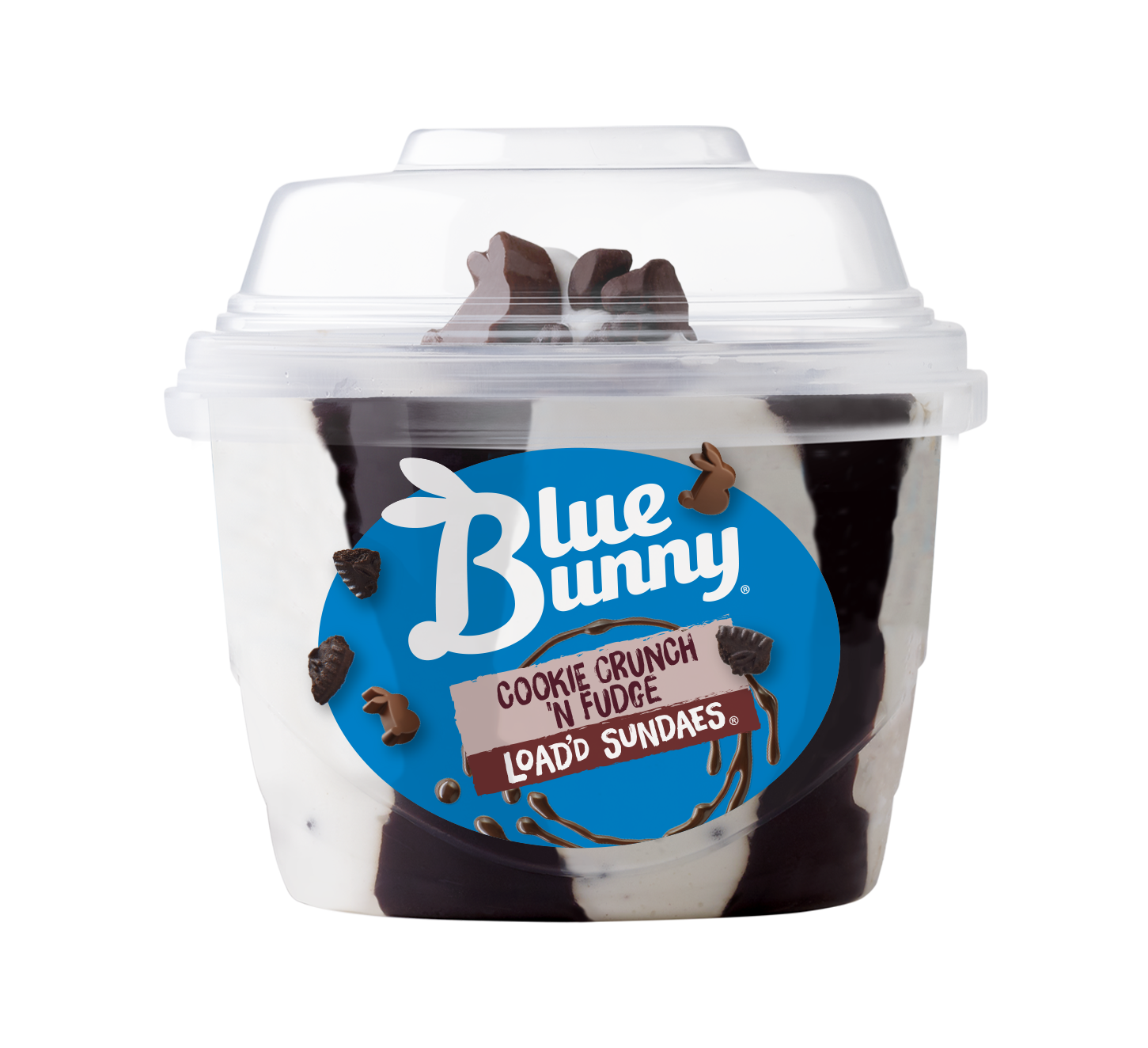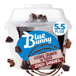 Now available in a 5.5 fl oz fun-sized cup! Indulge in the swirls and mix-ins packed into every spoonful of Blue Bunny Load'd Sundaes Cookie Crunch 'n Fudge Frozen Dairy Dessert. This one-of-a-kind cup is loaded to the max with sundae toppings, so there's never a boring bite. Soft vanilla flavored frozen dairy dessert is swirled through with ooey gooey fudge, mixed with chunks of chocolate cookies and fudge bunnies. It's a spoon-ready sundae experience straight from your freezer. What are you waiting for? Indulge in these portable, fully loaded frozen treats wherever you go. At work, in the car, on the couch—pretty much every place is more fun with these frozen desserts. Blue Bunny Load'd Sundaes come in compact, single-serve dessert cups, so it's easy to stock your freezer with all flavors of these sweet snacks. Blue Bunny—We Make Fun.