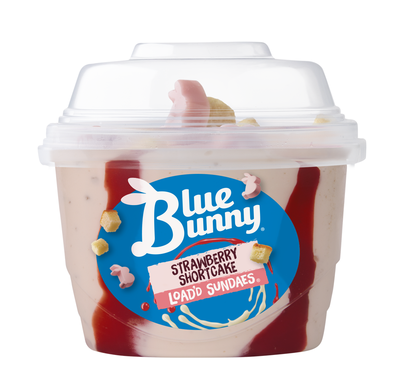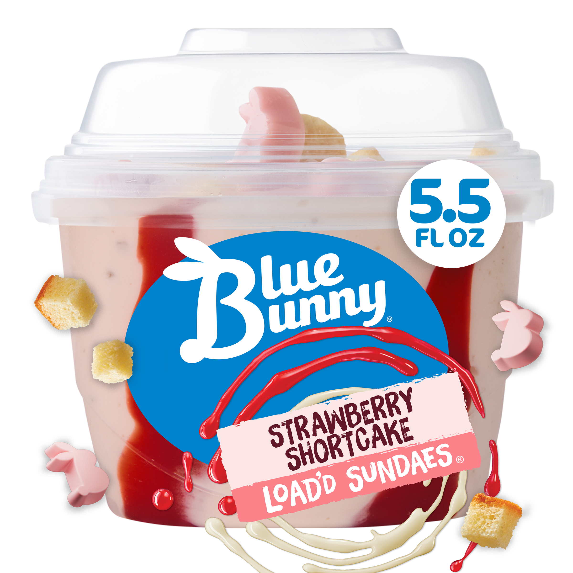 Now available in a 5.5 fl oz fun-sized cup! Indulge in the swirls and mix-ins packed into every spoonful of Blue Bunny Load'd Sundaes Strawberry Shortcake Frozen Dairy Dessert. This one-of-a-kind cup is loaded to the max with sundae toppings, so there's never a boring bite. Soft strawberry flavored frozen dairy dessert is swirled through with ooey gooey strawberry, mixed with real strawberries, shortcake pieces, and candy coated strawberry bunnies. It's your favorite strawberry dessert, now as a spoon-ready sundae experience straight from your freezer. What are you waiting for? Indulge in these portable, fully loaded frozen treats wherever you go. At work, in the car, on the couch—pretty much every place is more fun with these frozen desserts. Blue Bunny Load'd Sundaes come in compact, single-serve dessert cups, so it's easy to stock your freezer with all flavors of these sweet snacks. Blue Bunny—We Make Fun.