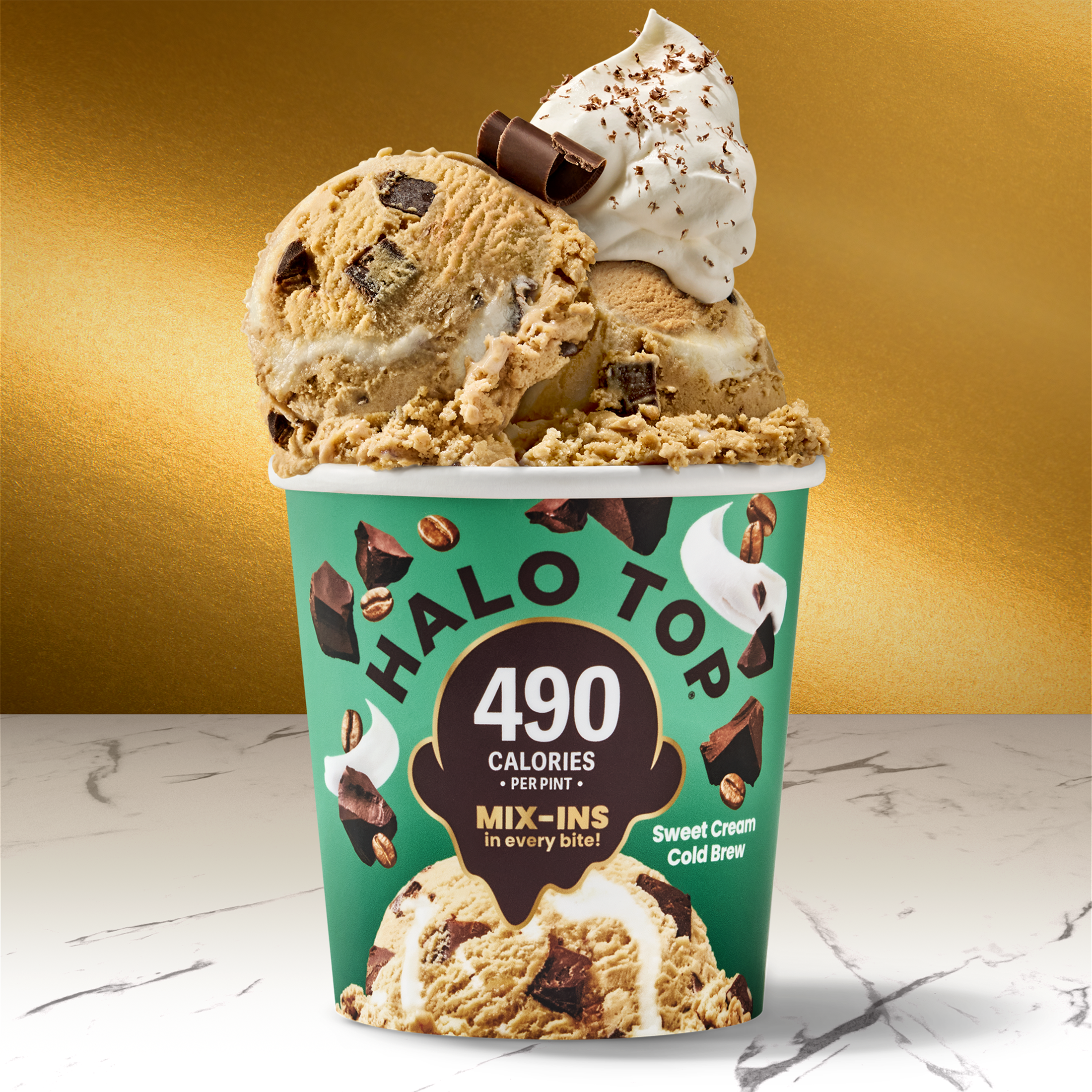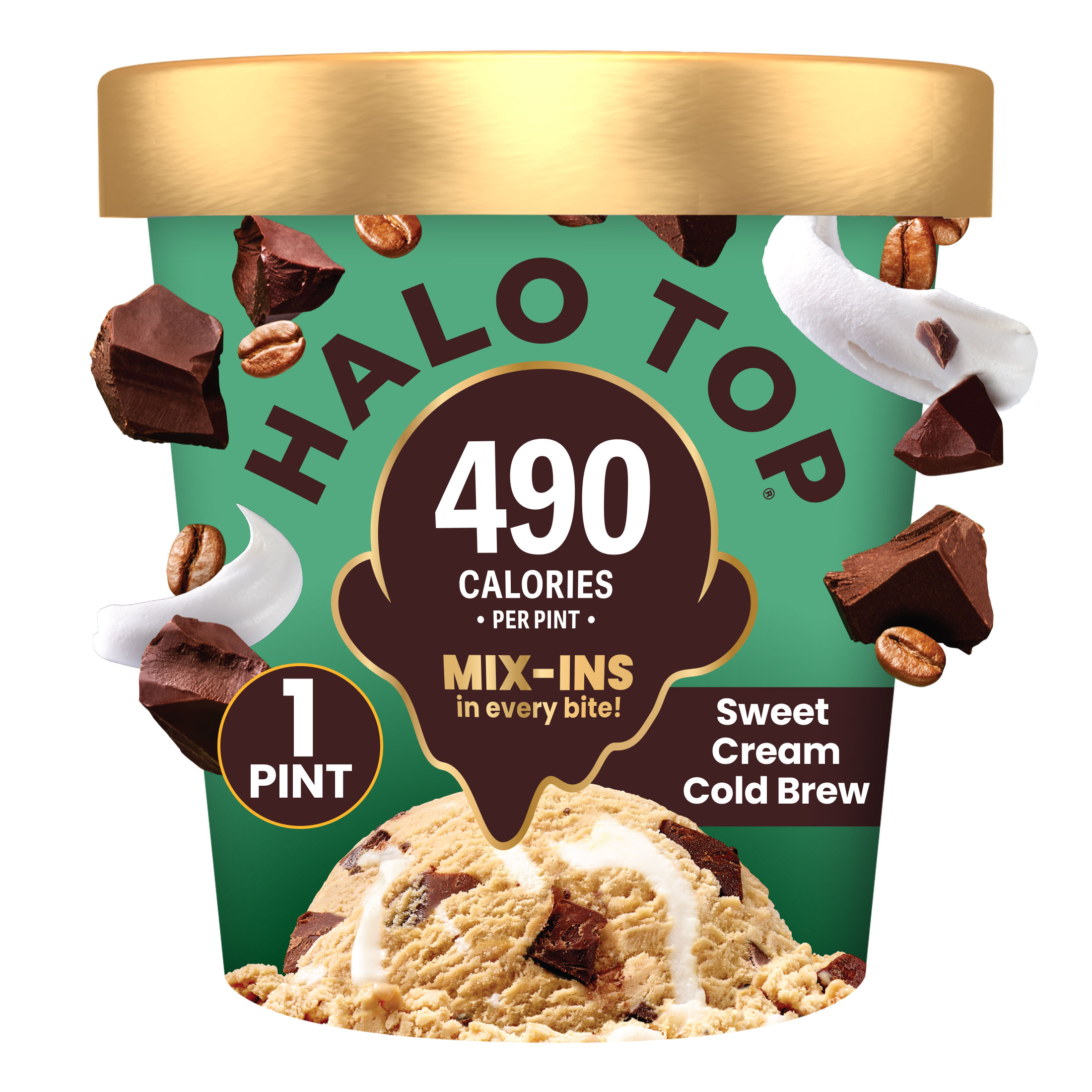 You’ll perk up for this treat that beats the cafe every time. Creamy cold brew light ice cream is swirled with luscious, sweet cream flavored ribbons and coffee-flavored chocolatey chunks. No barista needed. At Halo Top, we know that sometimes the best thing about ice cream is the mix-ins. Thats why we've loaded this pint with so many that you're sure to get some in every craveable bite.